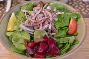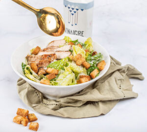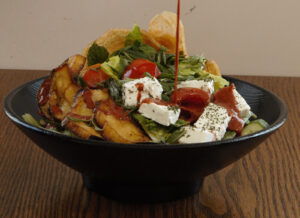 خس، كروتون(زيت زيتون، ثوم، مايونيز، خردل، حامض، بارميزان، اوريغانو)