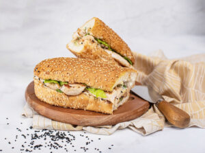 100 غرام صدر دجاج مسحب + خس ثوم+ كبيس + صوص خردل و عسل + خبز ساب مارين